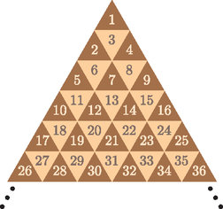 A szöveg csak Firefox böngészőben jelenik meg helyesen. Használja a fenti PDF file-ra mutató link-et a letöltésre. darab egységnyi oldalú szabályos háromszögből egy egység oldalú háromszöget állítottunk össze, és a kis háromszögeket felváltva sötétre és világosra színeztük. A háromszögekbe beírtuk sorban az számokat az ábra szerint. Mennyi a sötét háromszögekbe írt számok összege?