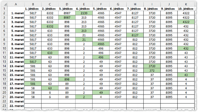 Szimuláljuk a játékot táblázatkezelő segítségével az alábbi mintát felhasználva. Minden sorban számítsuk ki az egyes játékosok számát, illetve jelezzük feltételes formázással, hogy ki a számoló játékos. A táblázatban csak az utolsó menetig jelenjenek meg adatok, de a munkafüzet legyen felkészítve a lehető leghosszabb, azaz legtöbb menetből álló játékra is. A megoldást a táblázatkezelő beépített függvényeivel készítsünk el, az L oszloptól jobbra segédcellákat használhatunk, de saját függvényt vagy makrót ne alkalmazzunk. A táblázat formázását a mintához hasonlóan alakítsuk ki. Beküldendő egy tömörített i575.zip állományban a megoldást tartalmazó munkafüzet és a megoldás rövid leírását bemutató dokumentáció. |