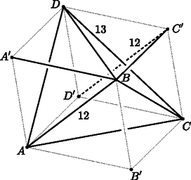 A 12 cm-es és 13 cm-es élek a tetraéder kitérő élei, így a bennfoglaló paralelepipedon egyik paralelogramma lapjának átlói az egymásra merőleges és élek. A paralelepipedon e lapjának területe az átlók alapján területegység. A paralelepipedon ehhez a laphoz tartozó magassága éppen a két kitérő él távolsága, tehát a megadott egység. A paralelepipedon térfogata így térfogategység. Az eddigiek alapján a tetraéder térfogata ennek harmadrésze, vagyis térfogategység.