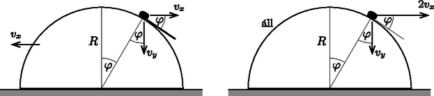A szöveg csak Firefox böngészőben jelenik meg helyesen. Használja a fenti PDF file-ra mutató link-et a letöltésre. Megoldás. A kis testre a nehézségi erő hat lefelé, valamint a félhenger által kifejtett nyomóerő a félhenger felszínére merőlegesen. A félhengerre a gravitációs erő hat lefelé, az alátámasztás által kifejtett nyomóerő fölfelé, és a kis testre kifejtett nyomóerő ellenereje. Vízszintes irányban külső erő nem hat, a rendszer vízszintes irányú lendülete állandó, végig nulla, mint a kezdeti pillanatban. Ez úgy lehetséges, ha a henger sebessége és a kis test sebességének vízszintes komponense azonos nagyságú és ellenkező irányú (1. ábra). Az energiamegmaradás törvénye szerint | |