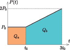 Ez az áramerősség akkor egyezik meg a korábban kiszámított áramerősséggel, ha vagyis a rúd sebessége A rúd vezetékek közötti részének hossza a mozgás végén Amikor a rúd még nem mozog, a feszültség is és az áramerősség is állandó, tehát a hőfejlődés teljesítménye is időben állandó . A rúd mozgása során az áramerősség időben állandó, de a rúdnak az áramvezetésben részt vevő hossza -ről -re nő, és emiatt az ellenállása is a kezdeti érték kétszerese lesz. Ennek megfelelően a teljesítmény is időben (egyenletesen) változik, és a mozgás végén lesz. Ábrázoljuk a hőfejlődés teljesítményét az idő függvényében. A grafikon alatti területek a fejlődött hő nagyságát adják meg.