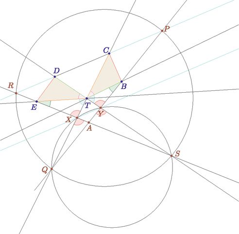 A szöveg csak Firefox böngészőben jelenik meg helyesen. Használja a fenti PDF file-ra mutató link-et a letöltésre. A szakaszhosszok egyenlőségeiből következik, hogy . Legyen az és egyenesek metszéspontja , az és egyeneseké pedig . Egy kis szögszámolással megmutatjuk, hogy . Az egybevágó háromszögekből , továbbá (csúcsszögek), tehát . Tudjuk még, hogy , tehát valóban egymáshoz hasonlóak az és háromszögek. Emiatt az is igaz, hogy , amiből pedig következik, hogy . Mivel is teljesül, így az és háromszögek hasonlóak, és ezért . Az és háromszögek hasonlóságából következik továbbá, hogy . Mivel és , ebből , ami azt jelenti, hogy trapéz. A hasonló háromszögek egymásnak megfelelő és szögeinek egyenlőségéből . Mivel a feltétel szerint , a és háromszögek is hasonlóak, hiszen megfelelő szögeik egyenlőek. A hasonlóság miatt | | azaz a , , , pontok egy körön vannak. Emiatt a háromszög külső szögeként , azaz . Mivel húrnégyszög, . Végül | | tehát húrnégyszög. |